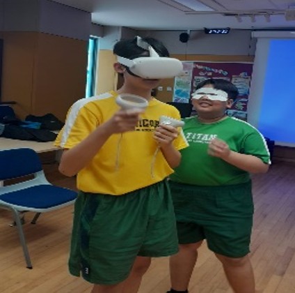 Chen Liu En 6E & Terrence Chong Khim Soon 6E, navigating the Minecraft World using VR Goggles.