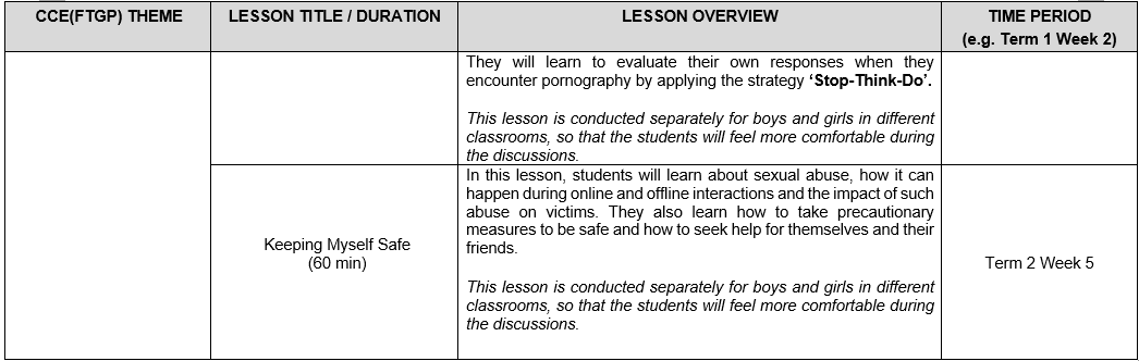 Sexuality Education (SEd) lessons are taught as part of CCE (FTGP) at Primary 5 and 6. Through these lessons, students will learn healthy ways to manage the physiological, social and emotional changes in their growing years. They learn to build healthy and rewarding relationships with others, including those with members of the opposite sex. Students are also guided to make wise, informed and responsible decisions to keep themselves safe from sexuality-related risks.